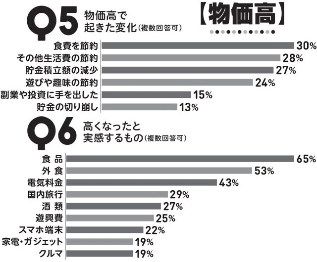 Q5「物価高で起きた変化」を見ると、近年の物価高の生活への影響は人によりさまざまだが、「今のところ問題ない」(グラフには未記載)という人は約3割。多くの人はなんらかの節約や我慢を強いられており、約2割の人が新たに副業や投資、あるいは転職(グラフには未記載)を考えていることがわかった。