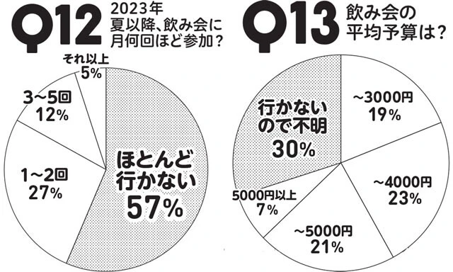 では、飲み会についてはどうか? まず参加頻度(Q12)を聞くと、なんと「ほとんど行かない」が全体の半数以上。月6回以上(≒週1を明らかに超えるペース)で飲みに行く人は全体の5%にとどまっており、社会の変化を感じるところだ。これも上の世代ほど行かない人が多い傾向が見て取れたのだが、コロナ禍で「ふらっと飲みに行く」習慣がなくなったということなのかもしれない。