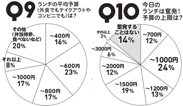 じゃあ、奮発するときはどのくらいまで払うか(Q10)。これは1000円超えの人が半分以上で、1500円オーバーも20%。これくらい予算があると、選びがいがあって楽しいランチになりそう。一方で、「奮発することはない」というシビアな回答も14%いた。