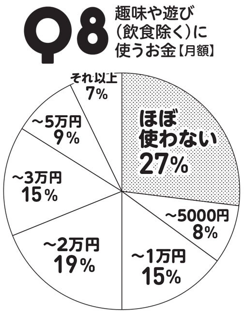 ところで、物価高の苦しさがより切実にわかるのがQ8「趣味や遊び(飲食除く)に使うお金」だ。ほぼ使わない人が4分の1を超えており、月に1万円以下の人を足すと全体の半分に及ぶ。ただし面白いのが、この質問に対する答えで、未婚/既婚や子供あり/なしでクロス集計しても、目立つ差は出なかった。お金に余裕があるか、猛烈に好きな趣味がある人は、結婚しようが子供がいようが「使う」ということだろうか。