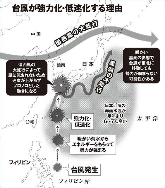 猛暑で日本近海の海面水温が高いため、日本に近づく台風の勢力は弱まらないばかりか、強まることすらある。そして、偏西風が北にあるため、台風は進む方向が定まらずノロノロ・ウロウロする。猛暑であればあるほど、台風の動きは遅くなるんです。猛暑が台風の強化や低速化につながっているんです。