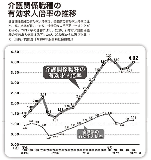――確かに、介護職の有効求人倍率の推移(グラフ)を見ても、誰でも採用してしまうくらい人手不足と言われても驚かないレベルですね......。何か採用した人にまつわるトラブルはありましたか?