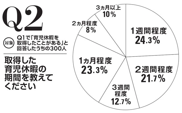 続いて、育休を取得した男性に、休暇期間についても聞いた。1ヵ月程度の人は約23%にとどまった一方、1週間から2週間程度という短期間の人が約半数を占めたが、これも厚労省の調査と一致すると平野氏は言う。