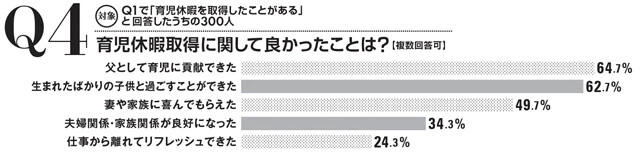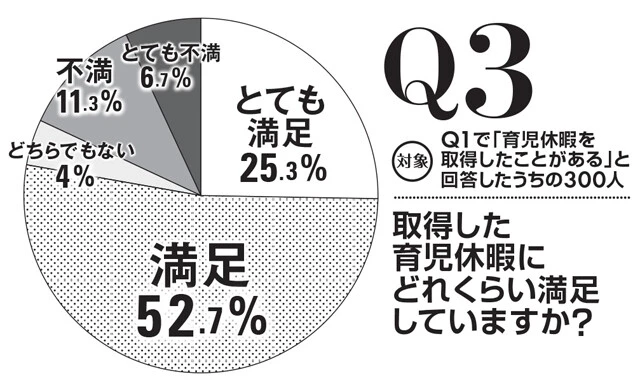 次に、育休の満足度と「育休を取得して良かったこと」についても聞いた。すると、約8割の人が「満足」と答え、その理由として、「父として育児に貢献できた」「生まれたばかりの子供と過ごすことができた」などのポジティブな回答が並んだ。
