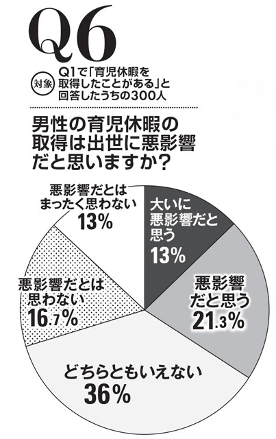 では実際、男性の育休取得は出世に悪影響があるのだろうか。この問いに「大いに悪影響だと思う」「悪影響だと思う」と答えた人は合計で約34%に上った。これを多いと見るか、少ないと見るか。平野氏はこう分析する。