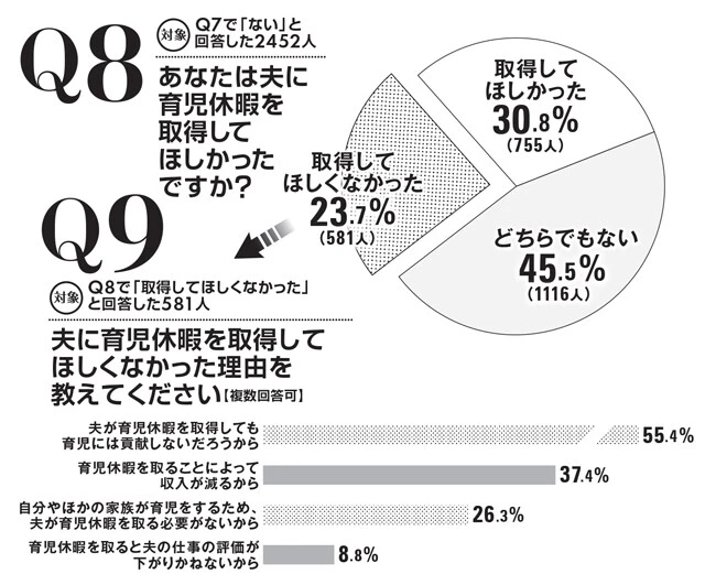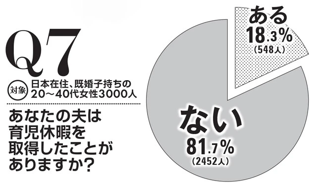 育児は男性だけでなく、家族の問題ということもあり、週プレでは既婚子持ちの20代から40代の女性3000人にも独自アンケートを実施。夫が育休を取得した家庭は約18%と同年代の男性へのアンケートよりも低い割合となったが、これとは別に興味深い結果が出た。