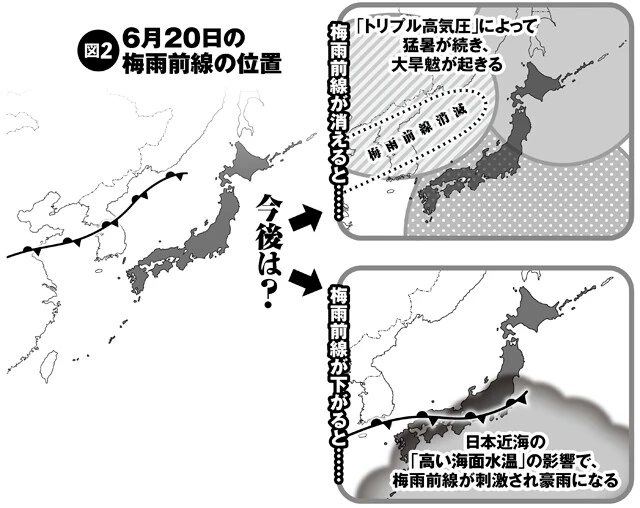 つまり、この3つの強力な〝トリプル高気圧〟があるために、偏西風や梅雨前線は北に押しやられてしまい、6月は記録的な猛暑になったということです」