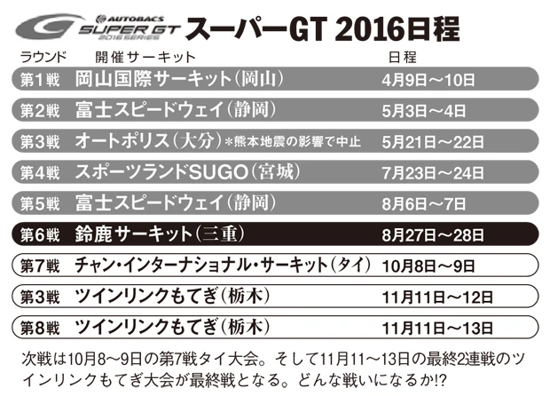 今後は相当の激戦かつ順位変動が予測される。次戦はタイのチャン・インターナショナル・サーキット、そして最終戦は11月のツインリンクもてぎだ。熊本地震でキャンセルされた第3戦オートポリスの振り替えレースが開催され、そのまま第8戦も行なわれる。激アツバトルを見逃すな!