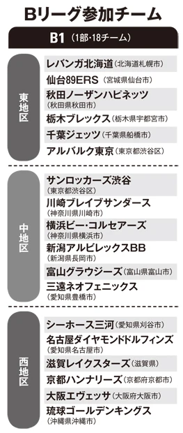 Bリーグは1部の「B1」(18チーム)、2部の「B2」(18チーム)という2部構成(Bリーグ入りを目指す「B3」9チームも存在)。1年ごとに入れ替え(昇格・降格)が行なわれる。