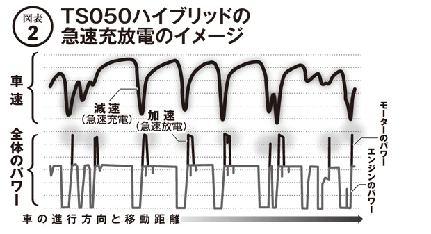 減速時に急速充電を行ない、ためた電気は加速時に急速放電してマシンをアシスト。ル・マンのサーキットでは1周当たり、8MJという大容量の急速充放電を行なう
