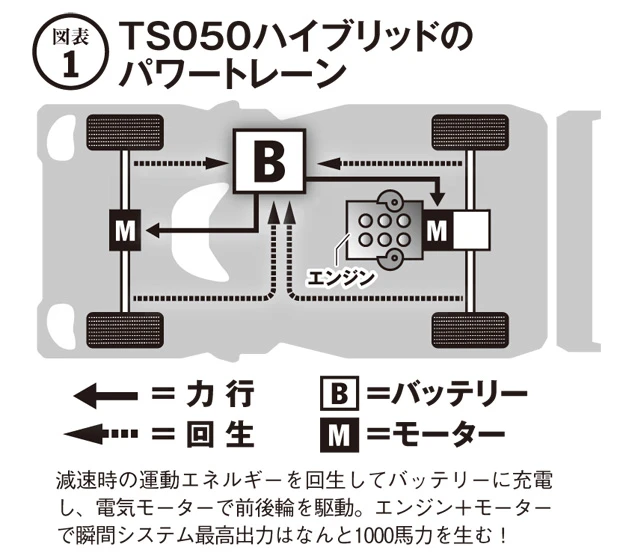 われわれのパワープラントを例に説明すると、2.4リットルのV6ターボエンジンの最高出力が約500馬力で、そこに電気モーターの約500馬力が加わって、全体でのパワーは約1000馬力。しかも、そのパワーを生み出す巨大な電気エネルギーを、マシンの減速時の数秒で回生エネルギーとしてバッテリーにため込み、コーナーからの立ち上がりの数秒で放電して解き放ちます。レーシング・ハイブリッドが市販車のそれと決定的に違うのは、大容量の急速充放電を短時間で繰り返すという点です。