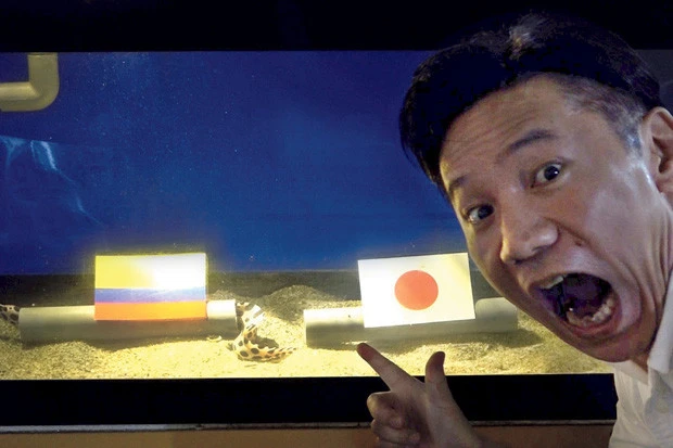 これは期待大! 早速、グループステージ初戦のコロンビア戦の勝敗を占ってもらうことに。狭い所に入り込むウツボの習性を利用して、両国の国旗を取りつけた細長いパイプを水槽の中に設置。