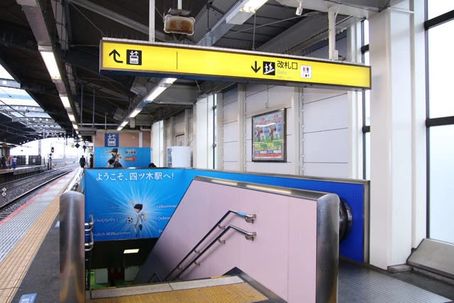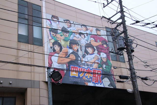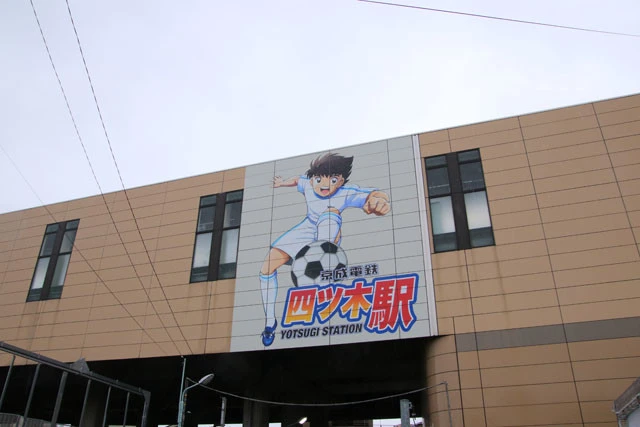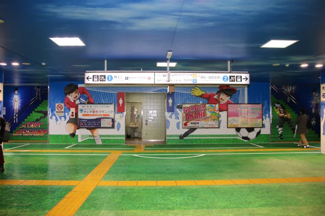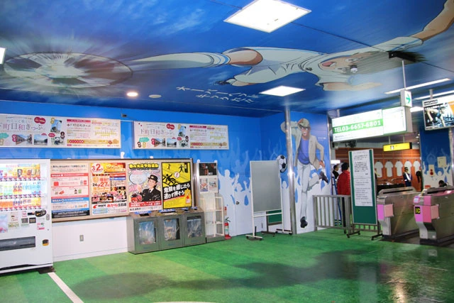 今回のイベントは、『キャプ翼』キャラクターでラッピングされた四ツ木駅の完成を記念したもの。駅の入口には大きなイラストが貼られ、階段や改札内に主人公・大空翼や若林源三など各キャラクターやその名シーンが紹介されている。