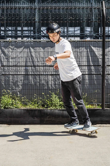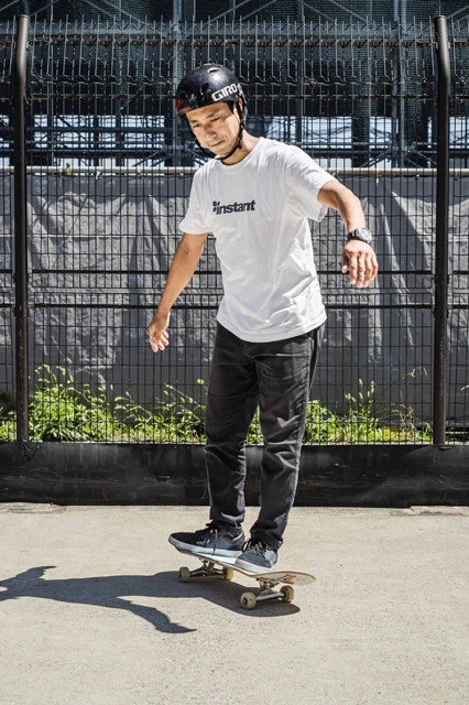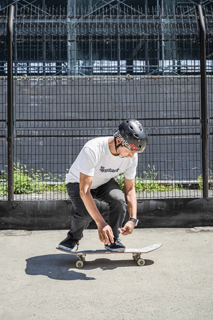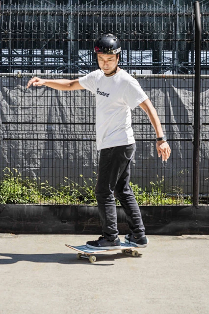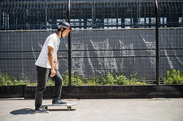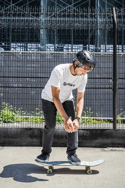 「動きやすければなんでもいいと思います。ただ靴はランニングシューズのような爪先が上がっているタイプだと危ないので、スリッポンなど靴底がフラットなものがいいでしょう。それとヘルメット。肘や手首を守るのも大事ですが、まずは頭。ヘルメット着用を義務づけるパークもありますが、そういうルールがなくても初心者はヘルメットをかぶっておくと安心です」