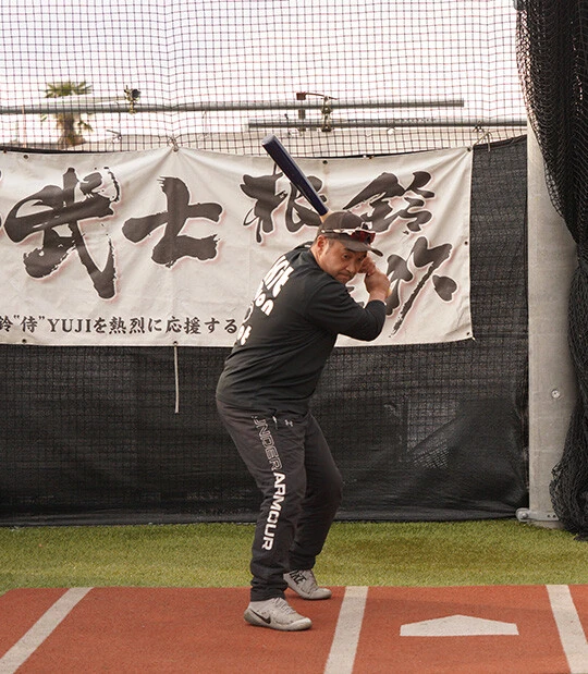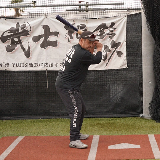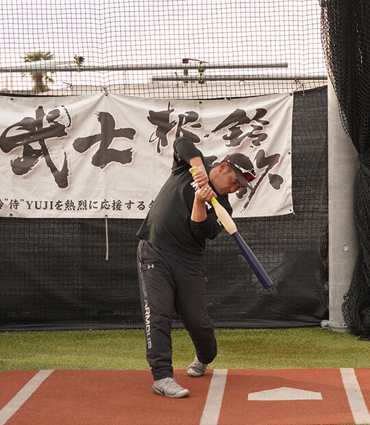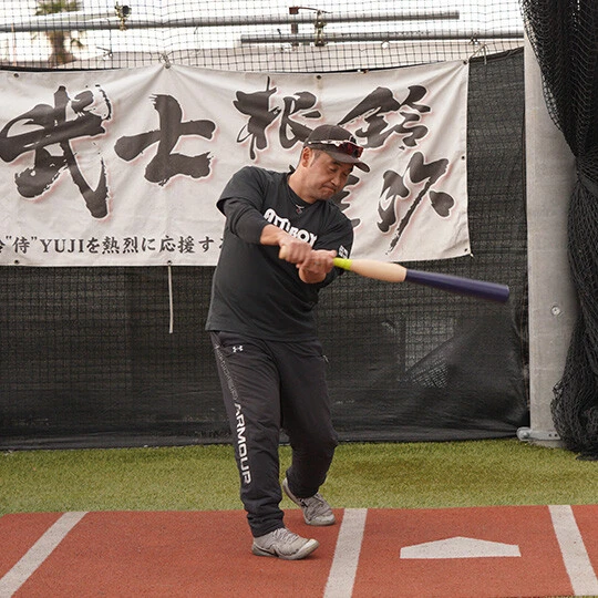 外のボールはキャッチャーに近い位置まで引きつけると届きやすいんですが、バットのヘッドを落とす『鬼ダウンスイング』はよりキャッチャーに近い位置でボールをとらえることができます。そこでラオウさんと理想の形について話し、まずはゴルフのサンドウエッジアイアンでバンカーからボールを出すようなスイングで、ボールとバットの角度のつけ方を身につけることからスタートしました」