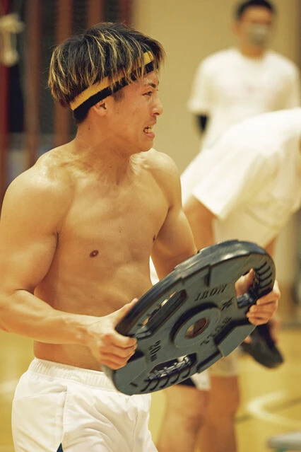 悪天候の日も体育館で肉体をいじめ抜いた。トレーニングの一環としてバスケットボールをプレーする場面も