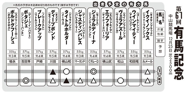 *各氏の予想は『週刊プレイボーイ1&2合併号』(12月19日発売)締め切り時のものです(騎手は予想です)