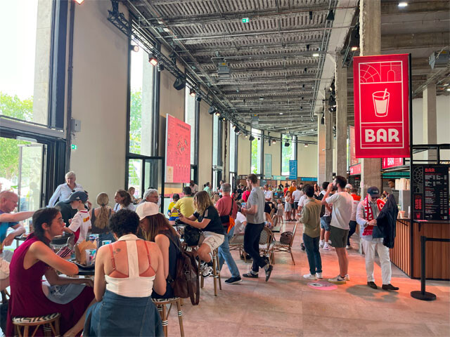 この施設が有料のホスピタリティ施設として大会期間中は運営されていました。さまざまな食べ物や飲み物が提供され、中庭に設置された巨大なビジョンで競技が生中継されています。マスコットの【フリージュ】と写真を撮れる場所や、オフィシャルグッズストアもあり、競技会場に入れなくても一日中五輪を楽しめる場所になっていて、こちらも多くの人で賑っていました。