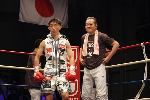 そして8回、コーナーで気合を入れるように大きな声を出すと、開始のゴングと同時に再び攻撃のスイッチが入ったように攻撃を仕掛けた。タイミングの良い左ジャブからのワンツー、いきなりの右ストレートから返しの左フック、角度を変えながらのアッパーなどでタフな相手を追い詰め、最後は速射砲のような連打を浴びせて試合をストップさせた。