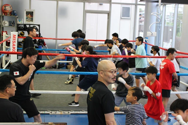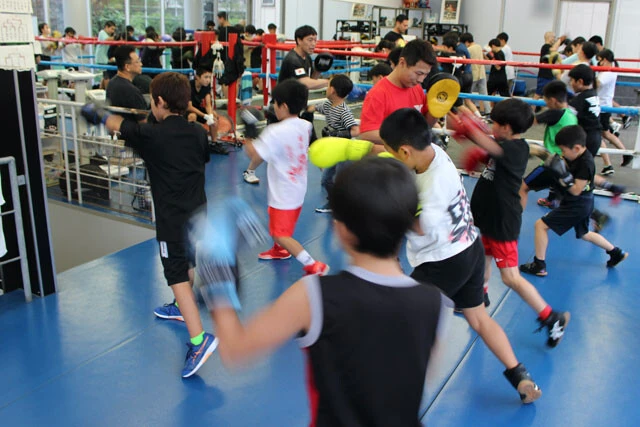 拳四朗は午後5時入り予定。その一時間前に始まるキッズボクシングのクラスで、他のトレーナーと一緒に大勢の子供たち相手に指導する加藤の姿があった。