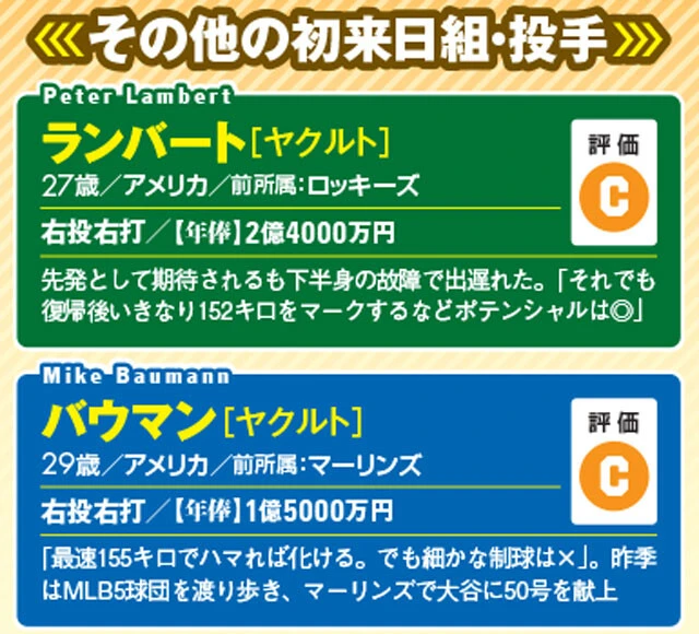 残念なのはヤクルト。毎年故障者だらけで"ヤ戦病院"というワードがすっかり定着してしまっているが、今季の新外国人投手ピーター・ランバート、マイク・バウマンも早々に故障離脱......(ランバートは3月22日に復帰)。