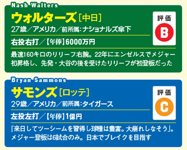![ボス[ロッテ]32歳/アメリカ/前所属:マリナーズ/右投右打/【年俸】3億円/MLB通算207試合登板と実績◎。先発を希望して来日。「球種は多彩だが、決め球に欠ける印象」。覚えたての日本語は「お先です」【評価B】](/news/sports/2025/images/Shingaikokujin04.jpg) ボス[ロッテ]32歳/アメリカ/前所属:マリナーズ/右投右打/【年俸】3億円/MLB通算207試合登板と実績◎。先発を希望して来日。「球種は多彩だが、決め球に欠ける印象」。覚えたての日本語は「お先です」【評価B】