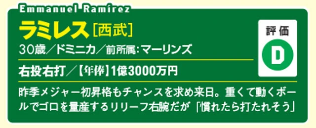 ボス[ロッテ]32歳/アメリカ/前所属:マリナーズ/右投右打/【年俸】3億円/MLB通算207試合登板と実績◎。先発を希望して来日。「球種は多彩だが、決め球に欠ける印象」。覚えたての日本語は「お先です」【評価B】