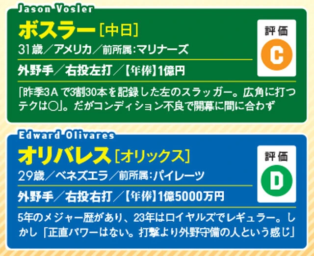 ディアス[オリックス]24歳/コロンビア/前所属:アスレチックス傘下/内野手/右投右打/【年俸】8000万円/「身長178㎝と大きくはないがパンチ力あり」。23年はヤンキース戦で3打席連続本塁打も記録。オフの楽しみは故郷コロンビアでの乗馬【評価A】