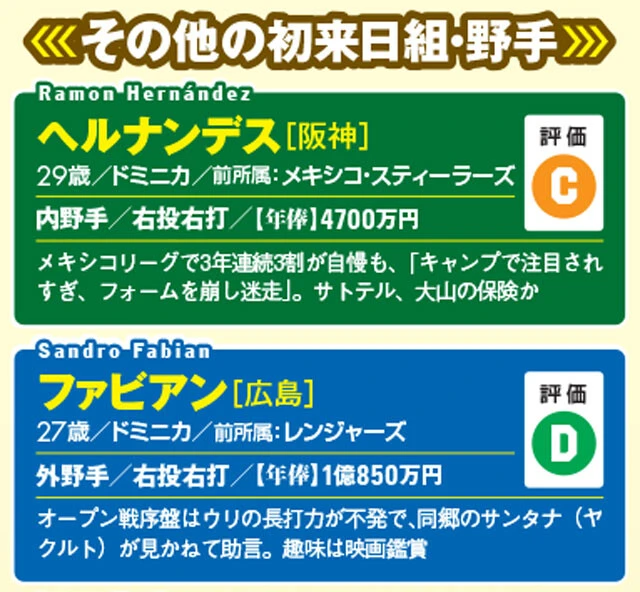 逆に、阪神のラモン・ヘルナンデス、広島のサンドロ・ファビアンに対しては、現時点での評価は辛い。