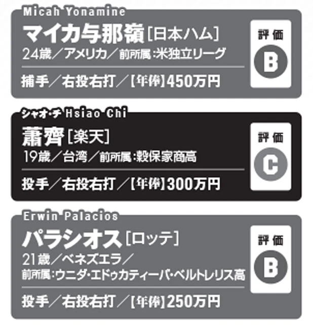 張峻瑋(チャン・ジュンウェイ)[ソフトバンク]19歳/台湾/前所属:穀保家商高/投手/右投右打/【年俸】400万円/昨夏台湾の高校を卒業した通称「火球男」。ロッテとの練習試合で「1軍デビュー」し最速153キロを計測。年俸は400万円だが契約金は1億円【評価A】