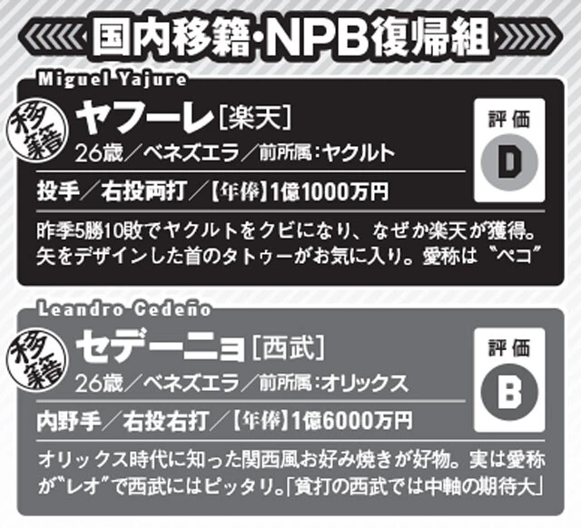 これまで「初来日組・投手」編、「初来日組・野手」編とお送りしてきたが、今回は「国内移籍・NPB復帰・育成契約組」編!