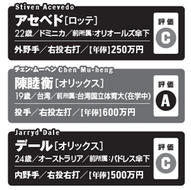 *評価は上から順にABCDの4段階。支配下登録選手は「戦力度」、育成契約選手は「将来性」を評価。*年齢は今季開幕時点 *年俸は推定、複数年契約は単年換算 *特別な表記のないコメントは同じリーグの球団に所属する先乗りスコアラーの寸評