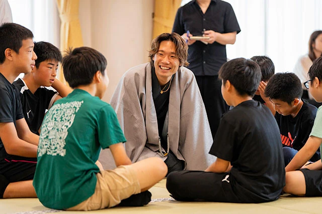 人生初という着物姿で登場。ワークショップでは子供たちに寄り添いながら、それぞれが抱える悩みに耳を傾けた。サッカーをしている子が多いこともあり、板倉は自身の中学時代の苦い記憶を包み隠さず話した。