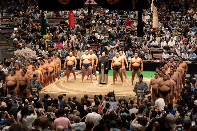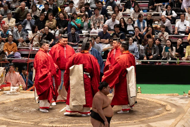 呼び出しは、かず差(かずさし)、奏名(ふしょう)、相撲長(すまいのおさ)に扮し、勝負審判を務める二所ノ関親方(元横綱・稀勢の里)、武隈親方(元大関・豪栄道)、音羽山親方(元横綱・鶴竜)、秀ノ山親方(元大関・琴奨菊)、大鳴戸親方(元大関・出島)は、出居(いでい)として、赤い装束で登場。ファンは、豪華かつ荘厳なたたずまいに、思わず息を呑んだ。