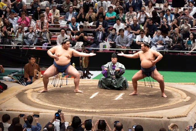 さらに、横綱2人による三段構えも披露された。上段の構え、中段の構え、下段の構えは、1909年、国技館が開館された際、常陸山(19代)と梅ヶ谷(20代)の両横綱が初めて披露して、その後も重要な儀式で演じられているもの。大の里(75代)、豊昇龍(74代)は息もピッタリに、三段構えを演じ終えた。