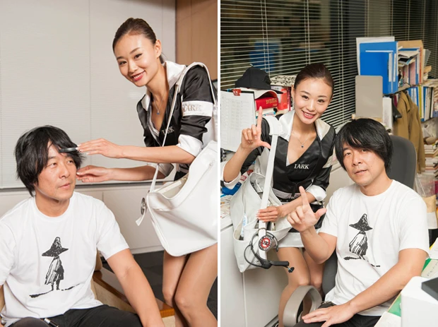 【画像左】ヘッドギアを装着して新次元の体験をスタートする貝山編集長 【画像右】「松永さんは、どちらの出身なのかな?」と、撮影中にも気さくにトークを進める編集長。人差指をビンビンに立てたラークサインもキメキメ!