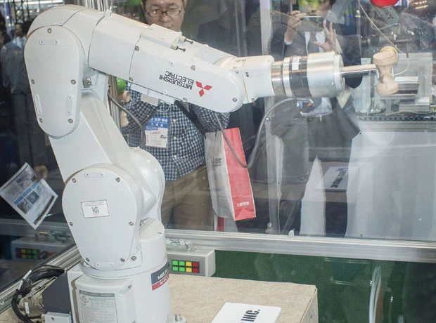 続いては、一見、生産性はないように見える、けん玉ロボット。だが、人間でも難しい微妙な力加減を、この6軸ロボット「RV-4FL」はいともたやすくやってのける。