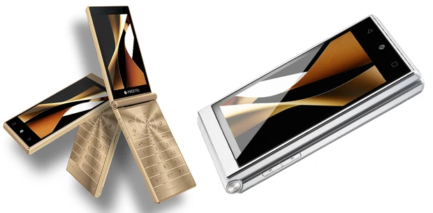 ●FREETEL MUSASHI プラスワン・マーケティング/実勢価格2万4千円前後【右】“スマホ+ガラケー=ガラホ”。過去にもこのコンセプトの機種は存在したが、こちらは本体の表・裏両面にディスプレイを搭載して、ほぼほぼフツーのスマホとして使用可能。もちろんタッチ操作に対応し、ガラケー、スマホの操作を二刀流で使える有能機種だ!【左】写真は折りたたんだ状態。ディスプレイはiPhone5Sと同じ4インチ。スマホ形態では片手で操作できるコンパクトさがイイ!