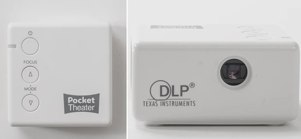 【左】本体サイズは幅52mm、縦52mm、高さ26mm。そして重量は70gという超軽量仕様。そしてボタンは3つだけ。電源ボタン、画面のピント調整、そしてメニューの選択ボタンとシンプルすぎ!【右】本体内に駆動時間約2時間のバッテリーを内蔵し、本体正面はレンズのみ配置したシンプル設計