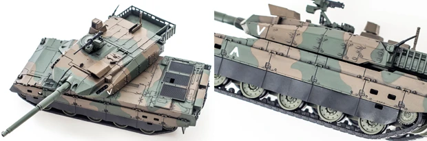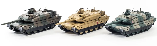 10式戦車のカラーラインアップ。(左から)「迷彩1」「デザートブラウン」「迷彩2」。「デザートブラウン」は実物では採用されていないオリジナル塗装。各5800円+税