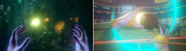 The Unspoken【左】VR SportsChallenge【右】【左】手から火の玉を出したり、巨大なブツを握って投げたりで敵を撃破するアクションゲーム。これは、ジェダイに一歩近づく感覚が楽しめますよ!【右】バスケ、アイスホッケー、アメフトなどを収録。ボールを握り、投げるなどTouchのスペックをフルに発揮。TheUnspokenとともにTouchに同梱