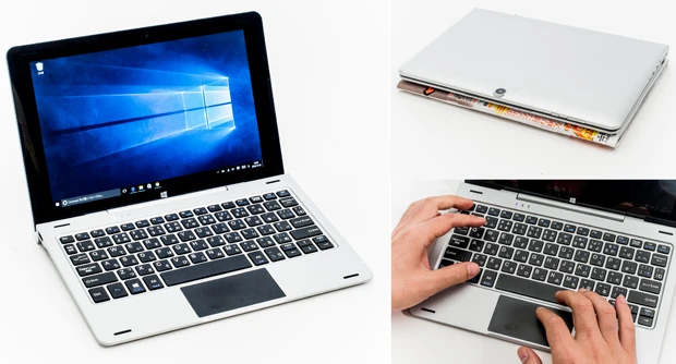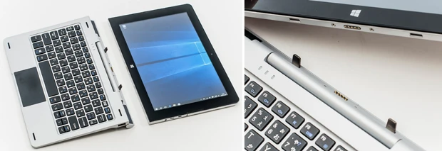 (上)タブレット部分とキーボード部分を分離した状態。キーボード部分にはUSB2.0×2、microUSB×1、microHDMI×1を装備して拡張性は十分すぎ!(左)タブレットとキーボードのドッキングはマグネットで接続するだけ。グラつきもなく剛性感もバッチリです
