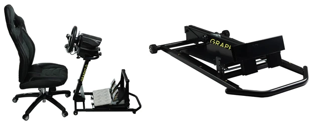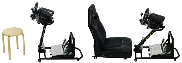 ハンドルやペダルなどの角度や長さを細かく調整できるので、上のゲーミング座椅子だけでなく、丸椅子でもプレイが可能だ