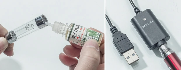 【左】純正リキッドは日本製。メンソール、レモン、グレープ風味を用意(各850円+税)。リキッドを入れるタンクは目盛り付き。国産メーカーならではの親切設計!【右】バッテリー充電は専用充電器を使用。アダプタはスマホ用を流用できる