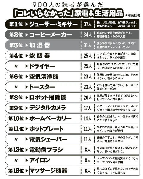 そこで週プレは読者900人にアンケートを実施し、「新生活で“コレいらなかった”家電&生活用品」を答えてもらった。これからひとり暮らしを始める人は、この結果を参考にして自分にとって何が本当に必要なものなのかを見極めてほしい。