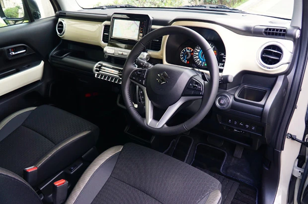 シフトレバー回りは全面的にメタリック調のパネル、ナビモニターはハスラー同様の独立デザインのまま見やすくなり、メーターパネル右側には各種情報の表示が可能な3.5インチマルチインフォメーションディスプレイを装備。