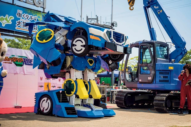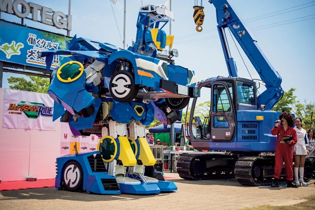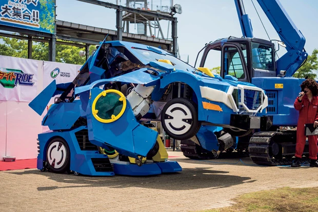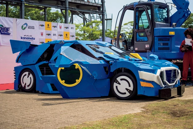 5月5日ツインリンクもてぎ(栃木県)で初めて一般公開された「J-deite RIDE」(ジェイダイト・ライド)は、ふたりまで搭乗できて、さらには人型(ロボットモード)←→車(ビークルモード)にトランスフォームする次世代ロボットだ。