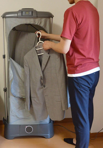 組み立て式のワードロープに熱風ユニットを装着し、60℃以上の熱風で衣類を大乾燥! 仕事で着たスーツはもちろん、洗濯物の部屋干しにも活用できるオイニー防止グッズ。