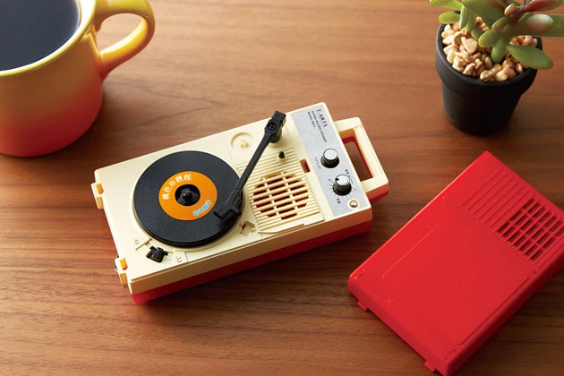 おなじみのポータブルプレイヤーのデザインですけど、中身はBluetooth対応のスピーカー。専用アプリを使えば、レコード部分をスクラッチしてDJ遊びもOK!