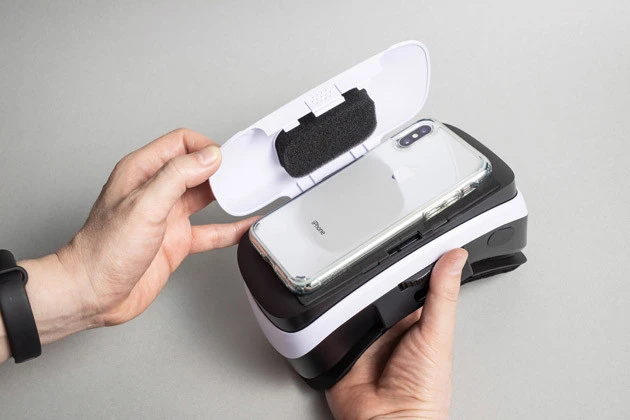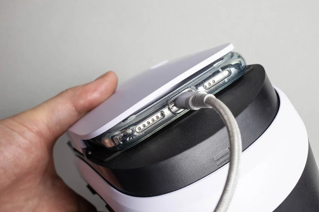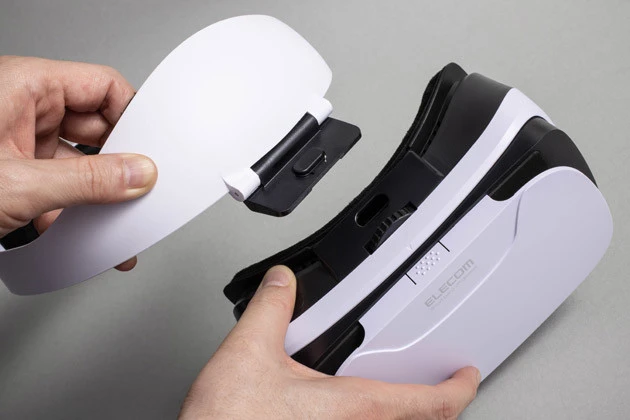 本体にケーブルを逃がすスペースがあり、充電やイヤホンを使用した状態のスマホでもVR視聴が可能だ。